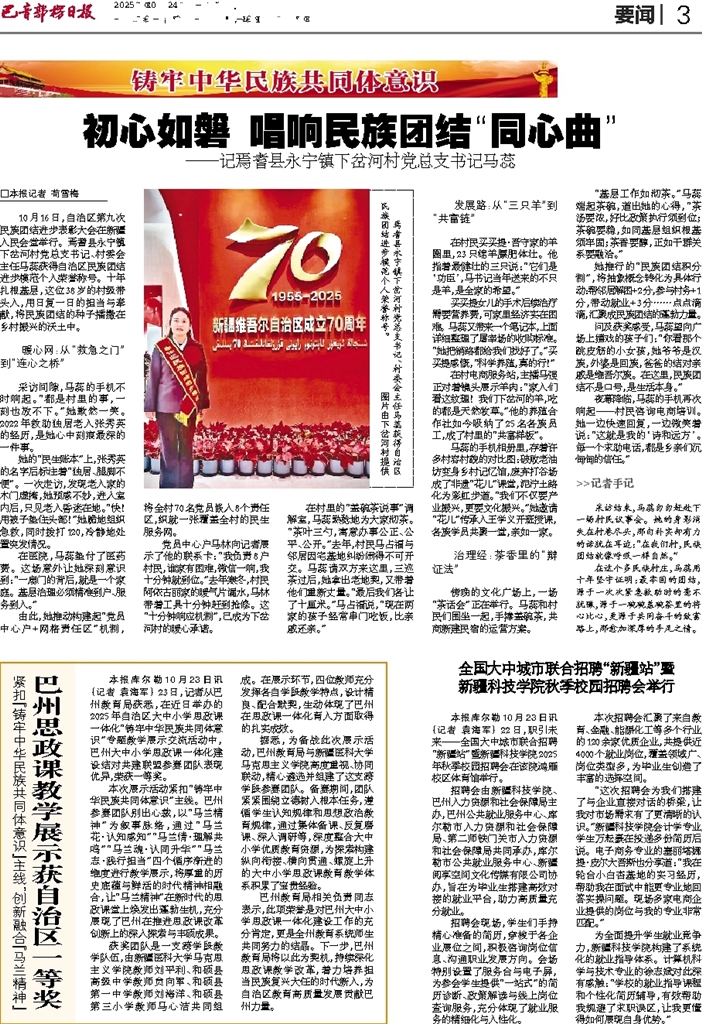 - 巴州思政课教学展示获自治区一等奖 本报库尔勒10月23日讯 (记者 袁海军) 23日,记者从巴州教育局获悉,在近日举办的2025年自治区大中小学思政课一体化“铸牢中华民族共同体意识”专题教学展示交流活动中,巴州大中小学思政课一体化