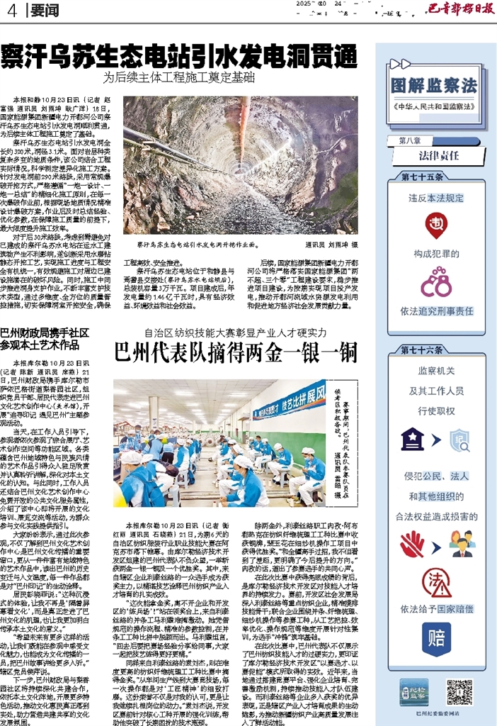 - 察汗乌苏生态电站引水发电洞贯通 本报和静10月23日讯 (记者 赵富强 通讯员 刘雨坤 耿广洋) 18日,国家能源集团新疆电力开都河公司察汗乌苏生态电站引水发电洞顺利贯通,为后续主体工程施工奠定了基础。 察汗乌苏生态电站引水
