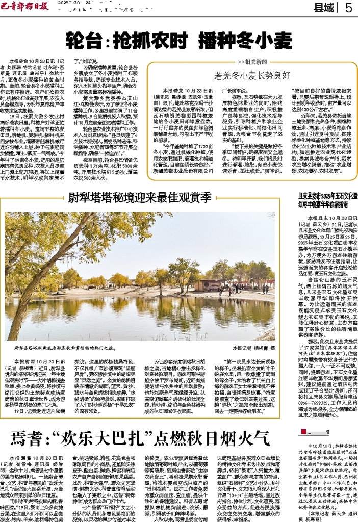 - 轮台:抢抓农时 播种冬小麦 本报轮台10月23日讯 (记者 刘雨珊 特约记者 吐尔逊·吾斯曼 通讯员 康兴平) 金秋十月,正值冬小麦播种的黄金时期。当前,轮台县冬小麦播种工作正有序推进。农户们抢抓农时,机械化作业高效开展,农