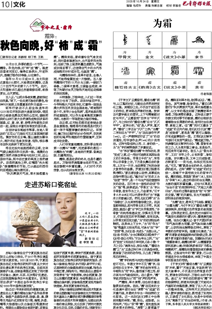 - 秋色向晚,好“柿”成“霜” □新华社记者 孙鹏程 胡了然 王帆 10月23日,秋季的最后一个节气——霜降。秋色向晚,好“柿”成“霜”。温度在昼夜间变幻,催得红染枝头,叶逐秋风,提醒万物作好准备,以应寒冬。 每年