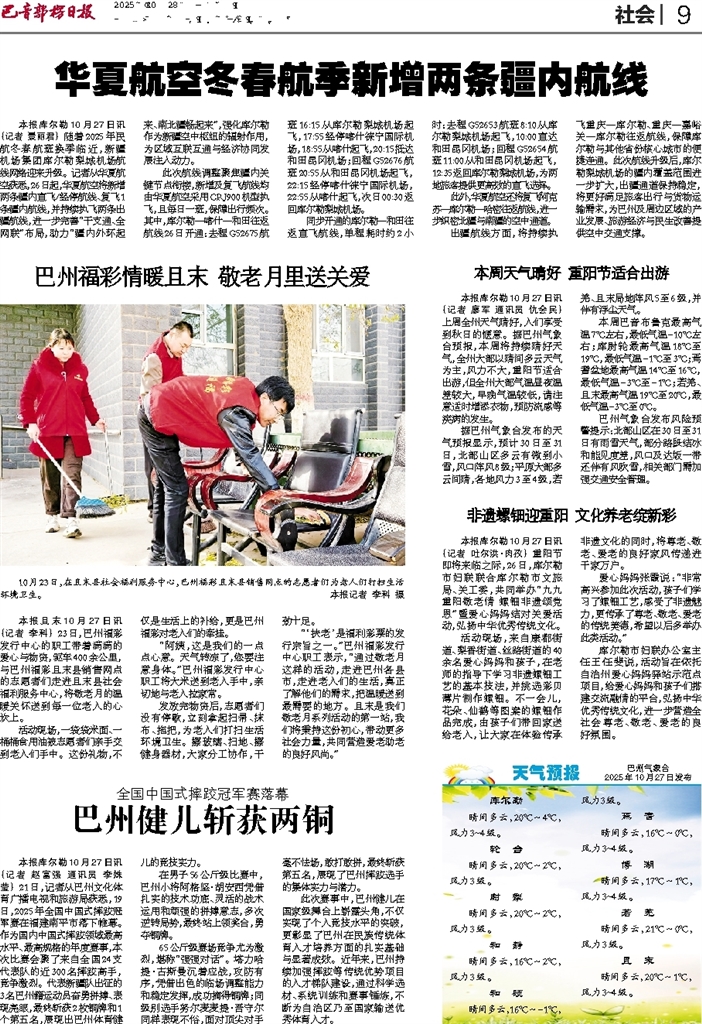 本报库尔勒10月27日讯 (记者 景丽君) 随着2025年民航冬春航班换季临近,新疆机场集团库尔勒梨城机场航线网络迎来升级。记者从华夏航空获悉,26日起,华夏航空将新增两条疆内直飞/经停航线、复飞1条疆内航线,并持续执飞两条出疆航线,进一步完善“干支通、全网联”布局,助力“疆内外环起来、南北疆畅起来”,强化库尔勒作为新疆空中枢纽的辐射作用,为区域互联互通与经济协同发展注入动力。