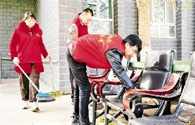 发放完物资后,志愿者们没有停歇,立刻拿起扫帚、抹布、拖把,为老人们打扫生活环境卫生。擦玻璃、扫地、擦健身器材,大家分工协作,干劲十足。