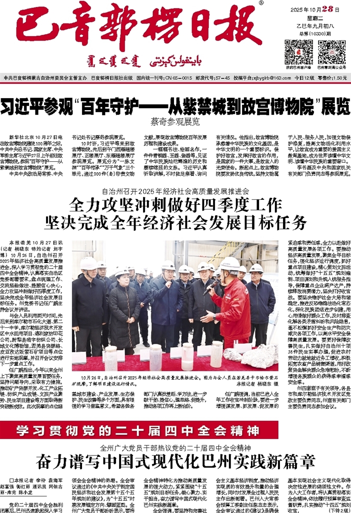 - 全力攻坚冲刺做好四季度工作 坚决完成全年经济社会发展目标任务 本报若羌10月27日讯 (记者 杨晓东 特约记者 刘宇博) 10月26日,自治州召开2025年经济社会高质量发展推进会,深入学习贯彻党的二十届四中全会精神,认真落实自治区党委部署要求,盘点梳理工作