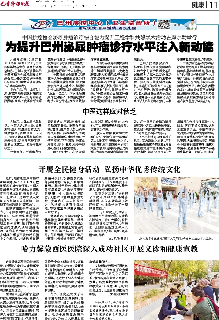 - 为提升巴州泌尿肿瘤诊疗水平注入新动能 本报库尔勒10月27日讯 (记者 廖军) 25日,由中国抗癌协会主办、新疆抗癌协会协办、巴州人民医院承办的中国抗癌协会泌尿肿瘤诊疗综合能力提升工程学科共建(库尔勒站)学术活动启动仪式在库尔勒举行。