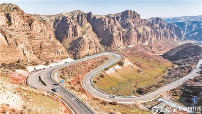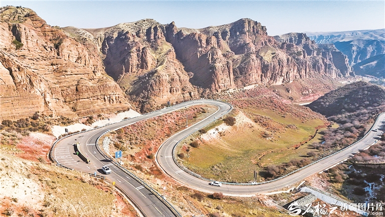 ▼金秋时节,呼图壁县南部山区蜿蜒的柏油路与丹霞地貌相映成景,壮美如画。