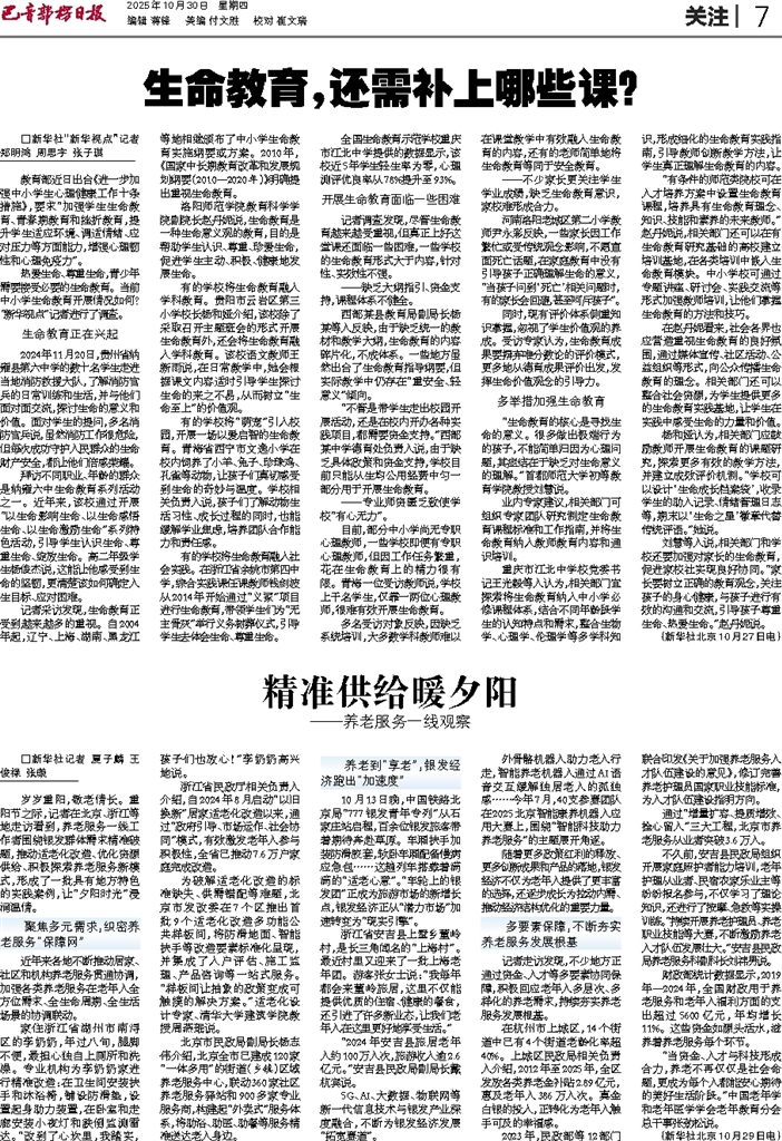□新华社记者 夏子麟 王俊禄 张璇 岁岁重阳,敬老情长。重阳节之际,记者在北京、浙江等地走访看到,养老服务一线工作者围绕银发群体需求精准破题,推动适老化改造、优化资源供给、积极探索养老
