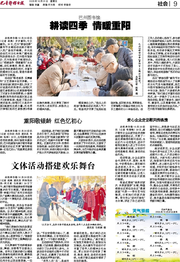 - 耕读四季 情暖重阳 本报库尔勒10月30日讯(记者 赵爽) 岁岁重阳,今又重阳。29日,巴州“耕读四季”重阳节主题活动在库尔勒市人民广场拉开帷幕。本次活动由巴州文化体育广播电视和旅游局主办、巴州图书馆承办、巴州党委老