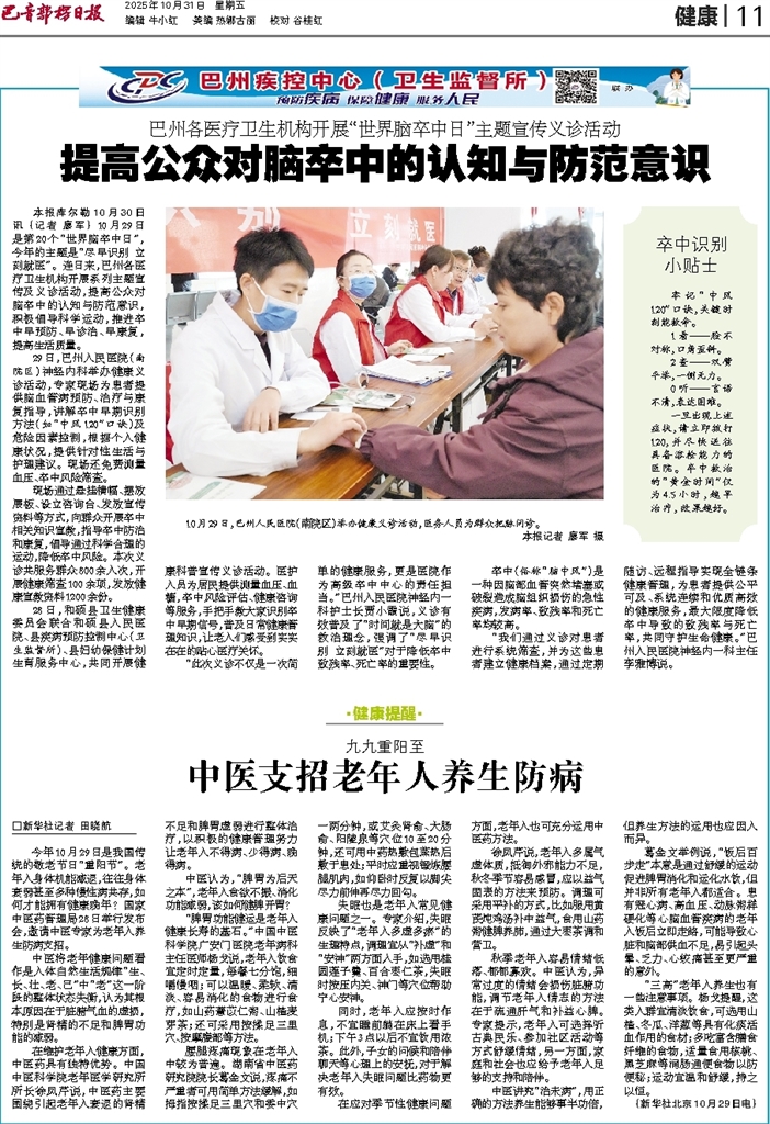 本报库尔勒10月30日讯 (记者 廖军) 10月29日是第20个“世界脑卒中日”,今年的主题是“尽早识别 立刻就医”。连日来,巴州各医疗卫生机构开展系列主题宣传及义诊活动,提高公众对脑卒中的认知与