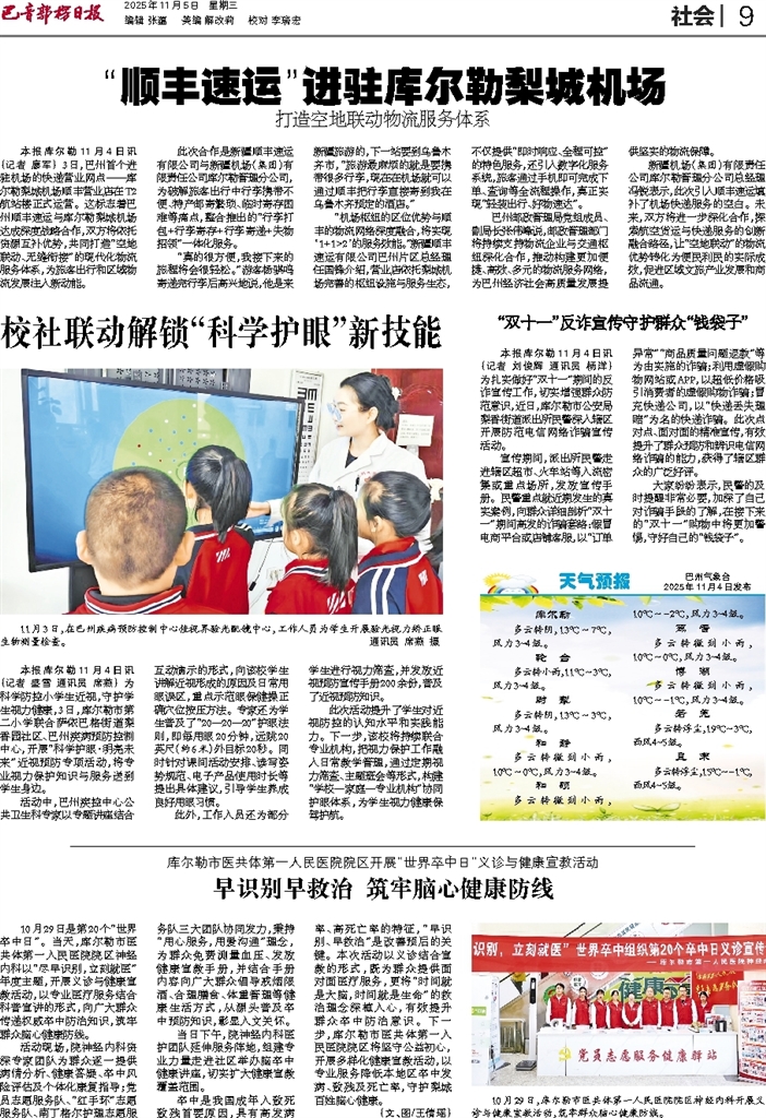 - 校社联动解锁“科学护眼”新技能 本报库尔勒11月4日讯 (记者 盛雪 通讯员 席燕) 为科学防控小学生近视,守护学生视力健康,3日,库尔勒市第二小学联合萨依巴格街道梨香园社区、巴州疾病预防控制中心,开展“科学护眼·明亮未来”近视