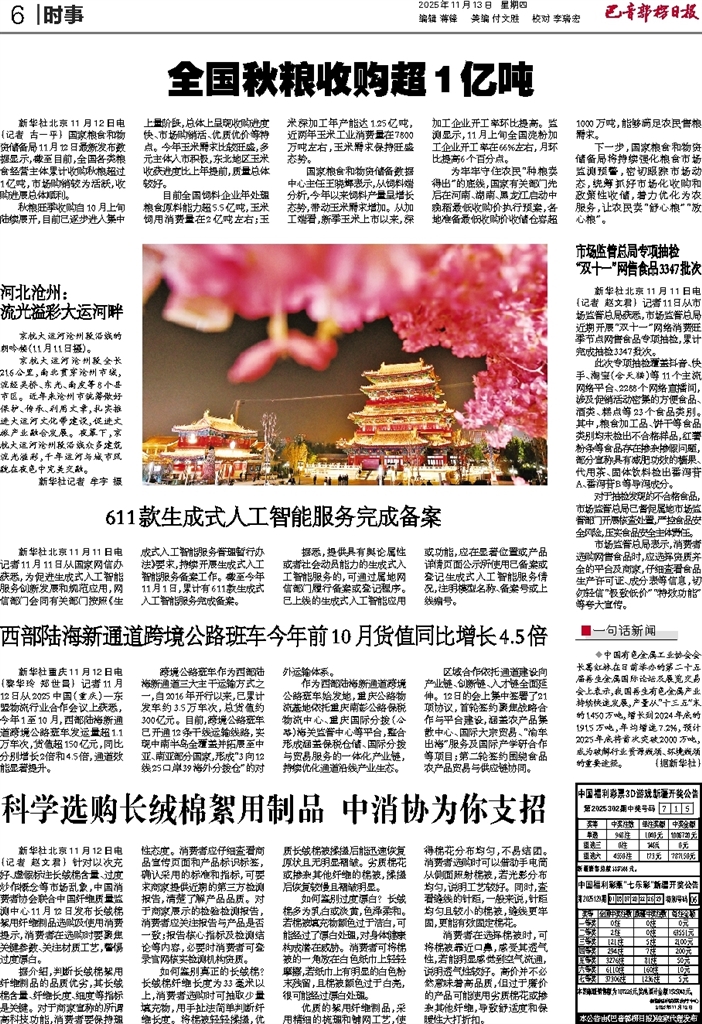 - 科学选购长绒棉絮用制品 中消协为你支招 新华社北京11月12日电(记者 赵文君) 针对以次充好、虚假标注长绒棉含量、过度炒作概念等市场乱象,中国消费者协会联合中国纤维质量监测中心11月12日发布长绒棉絮用纤维制品选购及使用消费提示,消费
