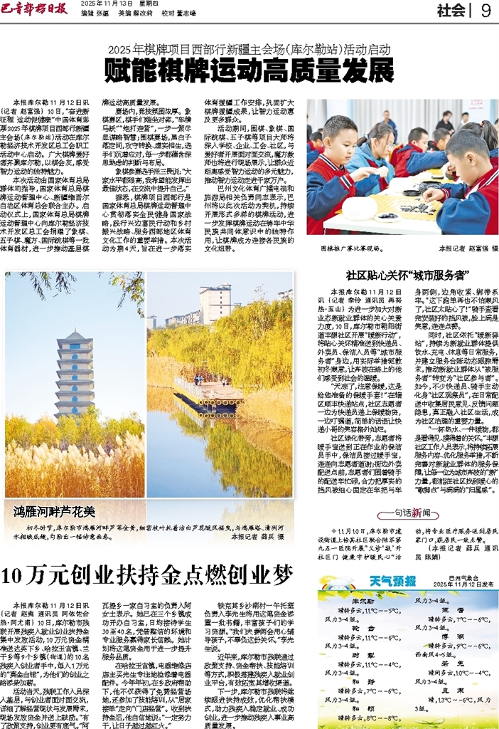 - 赋能棋牌运动高质量发展 本报库尔勒11月12日讯(记者 赵富强) 10日,“奋进新征程 运动促健康”中国体育彩票2025年棋牌项目西部行新疆主会场(库尔勒站)活动在库尔勒经济技术开发区总工会职工活动中心启动。广大棋牌爱好