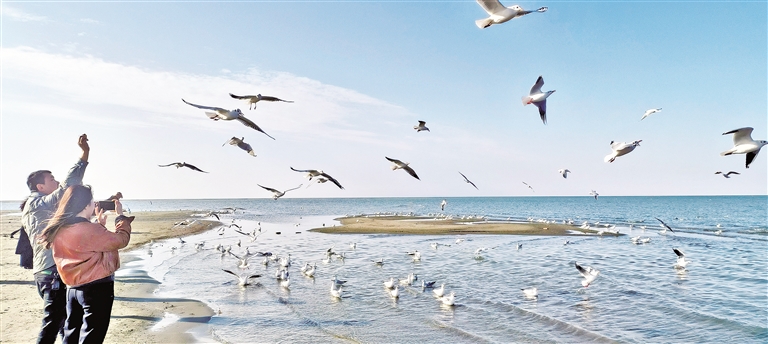 16日,来自云南的自驾游客王先生拿着馕块向空中抛撒,引得成群沙鸥围拢而来。“真没想到,在新疆的冬天能见到这么多水鸟!湖面壮阔、公路通畅,随手一拍都是美景。”王先生一边投喂一边感慨。他特意在沿途售卖处买了馕,沉浸式体验与水鸟互动的乐趣。