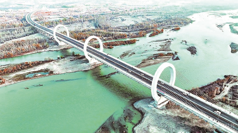 11月15日,车辆在伊犁河三桥上行驶。该桥是国内首座三塔四跨“O”形矮塔斜拉桥,11月11日正式通车。通车后,两岸车程从1小时缩短至5分钟。据《新疆日报》(张庆华 摄)