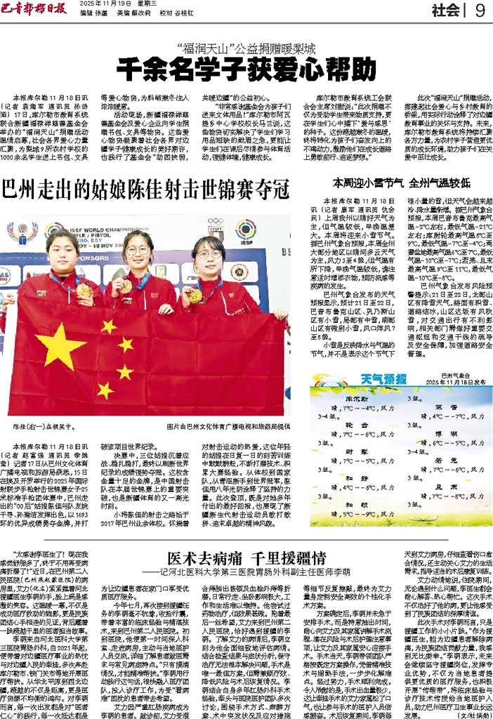 - 巴州走出的姑娘陈佳射击世锦赛夺冠 本报库尔勒11月18日讯 (记者 赵富强 通讯员 李姝莹) 记者17日从巴州文化体育广播电视和旅游局获悉,15日在埃及开罗举行的2025年国际射联步手枪射击世锦赛女子25米标准手枪团体赛中,巴州走