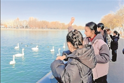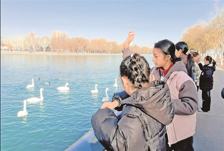杜鹃河畔成为人与自然和谐共生的舞台,数百只越冬天鹅在水面悠然嬉戏、展翅起舞。爱心妈妈们讲解天鹅的习性与城市生态保护的故事,孩子们则兴奋地分享所见所感,沉浸式体验“天鹅之城”的独特魅力。“走出课堂,近距离接触天鹅,感觉棒极了!我要努力学习,将来为建设美丽家乡贡献力量。”巴州一中学生穆尼塞·图尔迪说。