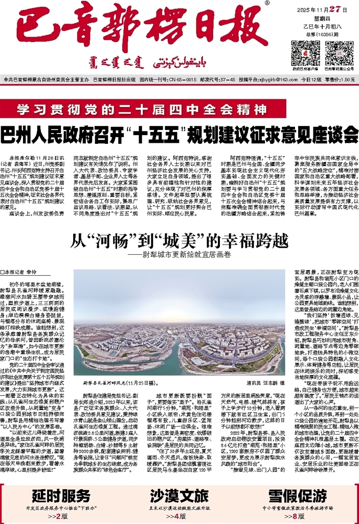 □本报记者 李伶 初冬的塔里木盆地南缘,尉犁县孔雀河畔暖意融融。澄澈河水如碧玉腰带穿城而过,塑胶步道上,三三两两的居民或闲谈漫步、或慢跑健身;岸边棵棵白蜡身姿挺拔,与错落分布的休闲座椅