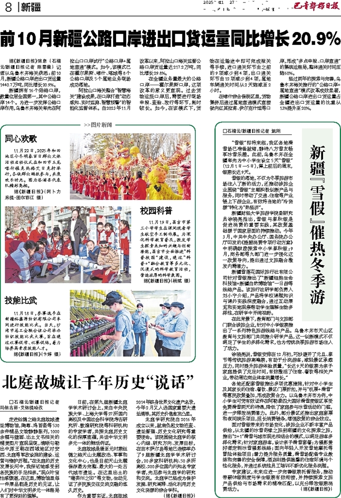- 同心欢歌 11月22日,2025年和田地区今冬明春百日群众文体活动启动仪式在和田市玉龙喀什镇克热格艾日克村举行,各族群众踊跃参与,共度欢乐时光。图为洛浦县代表队精彩亮相。 据《新疆日报》(阿卜力米提·图