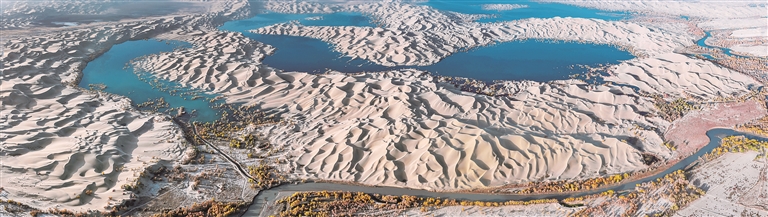 据悉,得益于近年来的生态输水,这片区域形成了8个“湖泊”。清澈的湖水环绕着顽强生长的胡杨,构成“水映胡杨、沙湖相依”的独特景观,极具观赏性。