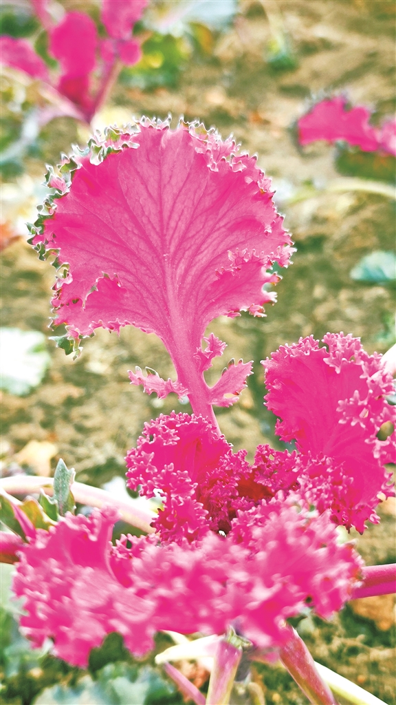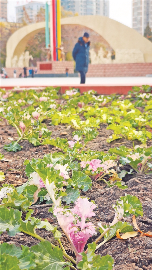 冬日的库尔勒市人民广场,色泽艳丽的羽衣甘蓝在花池中铺展,粉紫、黄绿等色彩交织,呈现一抹灵动的亮色,尽显城市冬日之美。本报记者 薛兵 摄