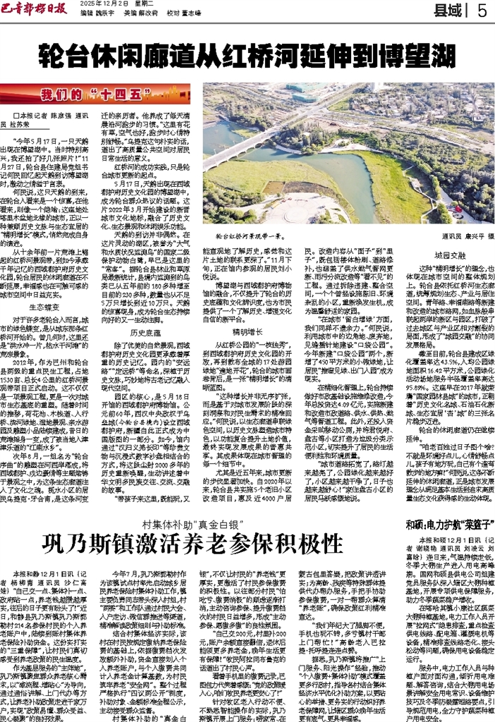 - 轮台休闲廊道从红桥河延伸到博望湖 □本报记者 陈彦强 通讯员 拉苏荣 “今年5月17日,一只天鹅出现在博望湖中。当时特别高兴,我还拍了好几张照片!”11月27日,轮台县住建局党组书记何民回忆起天鹅到访博望湖时,激动之情