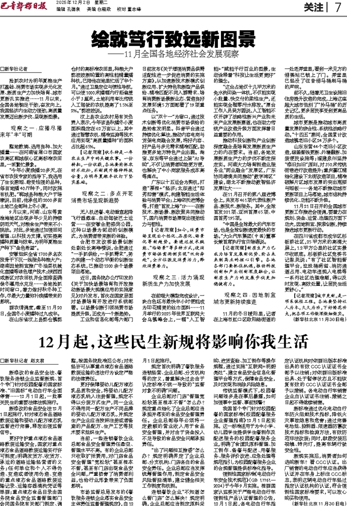 □新华社记者 赵文君 新修改的食品安全法、餐饮服务连锁企业监管新规、首个专门针对校园配餐的国家标准、“旧国标”电动自行车全面停售……12月1日起,一批事关民生的重要法律法规施行。