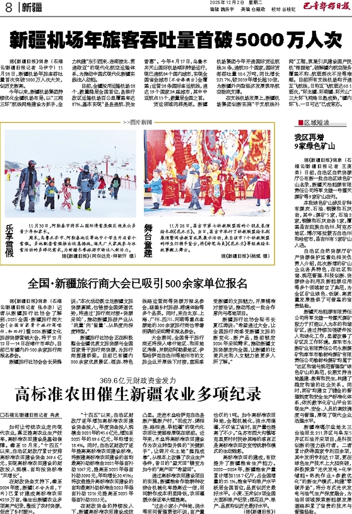 - 新疆机场年旅客吞吐量首破5000万人次 据《新疆日报》消息 (石榴云/新疆日报记者 马伊宁) 11月28日,新疆机场年旅客吞吐量首次突破5000万人次大关,创历史新高。 今年以来,新疆机场集团持续优化全疆机场布局,以“三网三环”航线