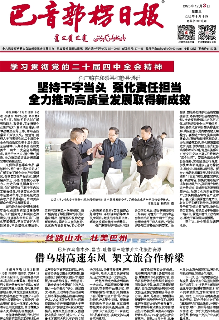 本报库尔勒12月2日讯 (记者 陈城市 通讯员 安梅) 11月24日至28日,巴州在乌鲁木齐市、昌吉州、吐鲁番市三地开展系列文旅产品宣传推介活动,抢抓交通发展重大机遇,强化重点客源地合作,释放文旅辐射效应。此次活动通过“专场推介+合作洽谈+校园推介+文旅快闪+商品展销”五位一体模式,全方位展示巴州文旅魅力,累计覆盖万余人次,取得良好宣推成效。