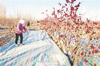 近日,在良种场红枣种植基地,枣农周刚正穿梭其间,熟练地采收着已自然风干的红枣。他说:“我种植的40亩红枣,今年预计能产出10吨左右的红枣。我们在枣园里建了烘干房,红枣采收后经过烘干处理,就可以通过订单模式进行销售。”