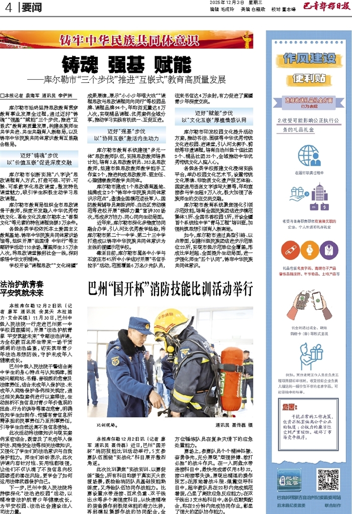 - 铸魂 强基 赋能 □本报记者 袁海军 通讯员 李俨洲 库尔勒市始终坚持思政教育贯穿教育事业发展全过程,通过迈好“铸魂”“强基”“赋能”三个步伐,推进“互嵌式”教育高质量发展,构建各族师生共学共进、共生共融育