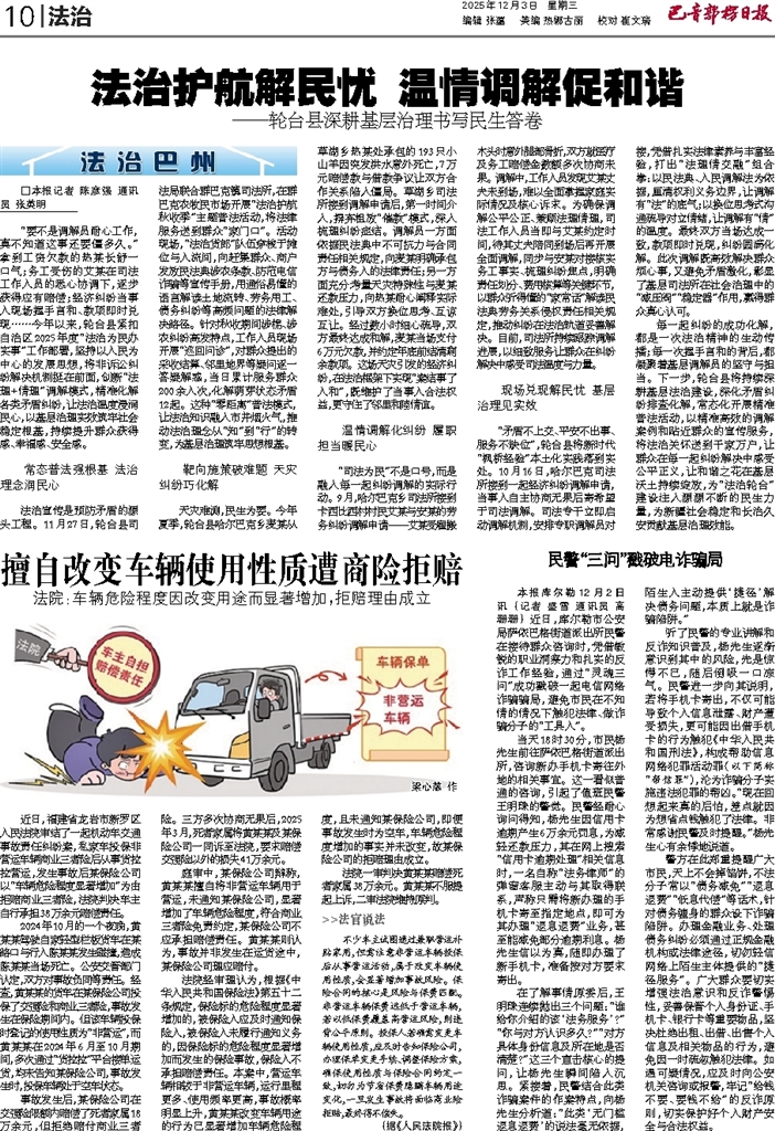 - 法治护航解民忧 温情调解促和谐 □本报记者 陈彦强 通讯员 张英明 “要不是调解员耐心工作,真不知道这事还要僵多久。”拿到工资欠款的热某长舒一口气;务工受伤的艾某在司法工作人员的悉心协调下,逐步获得应有赔偿;经济纠纷