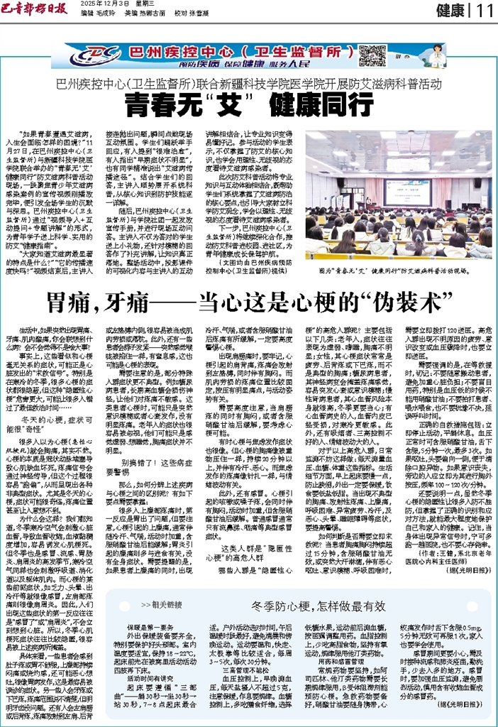 - 青春无“艾” 健康同行 “如果青春遭遇艾滋病,人生会面临怎样的困境?”11月27日,在巴州疾控中心(卫生监督所)与新疆科技学院医学院联合举办的“青春无‘艾’健康同行”防艾滋病科普活动现场,一段聚焦青少年艾滋病感染案例的宣
