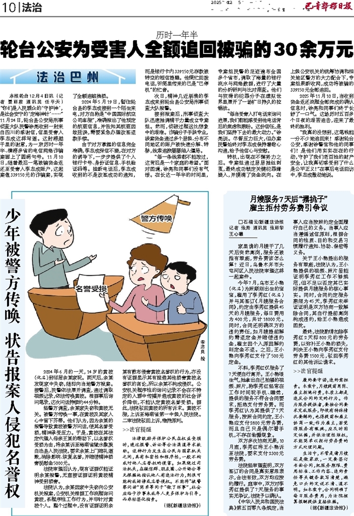- 少年被警方传唤 状告报案人侵犯名誉权 2024年6月的一天,14岁的黄波(化名)到邻居余某家玩。两天后,余某发现家中失窃,随即向当地警方报案。接警后,民警依法展开调查,通过调取视频记录,依法传唤黄波。根据事后询问笔录,这次问话持续约4