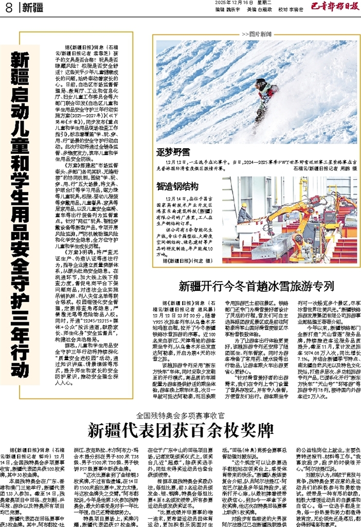 - 新疆启动儿童和学生用品安全守护三年行动 据《新疆日报》消息 (石榴云/新疆日报记者 索蓉芝) 孩子的文具是否合格?玩具是否暗藏风险?校服是否安全舒适?这些关乎少年儿童健康成长的问题,始终牵动着家长的心。日前,自治区市场监督管理局、教育厅