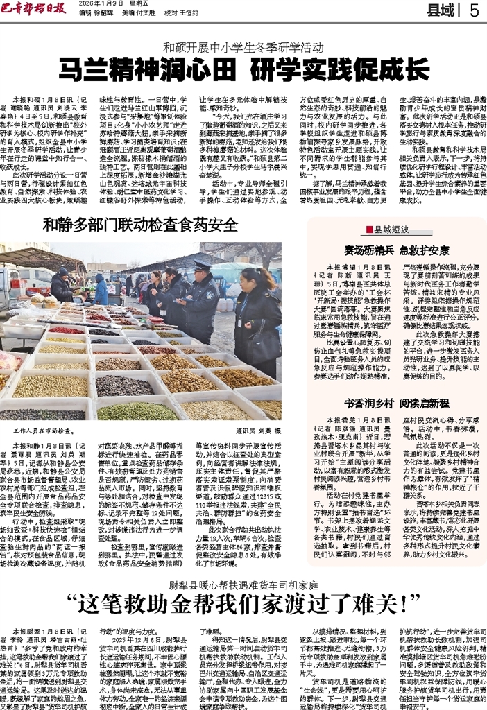 - 书香润乡村 阅读启新程 本报若羌1月8日讯 (记者 陈彦强 通讯员 曼孜热木·亚克甫) 近日,若羌县吾塔木乡昆其村与牧业村联合开展“新年,从学习开始”主题阅读分享活动,以富有新意的形式激发村民阅读兴趣,营造乡村书香氛围。