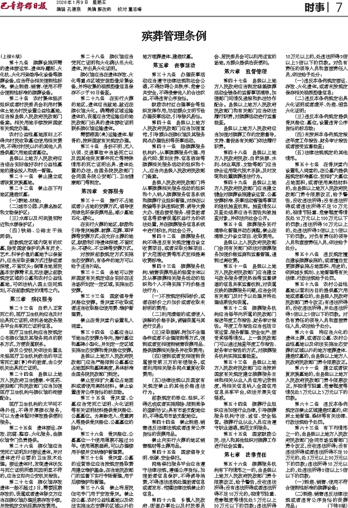 (上接6版) 第十九条 殡葬设施所需的遗体接运车、遗体冷藏柜、火化机、火化污染物净化设备等殡葬设备,应当符合相关强制性标准。禁止制造、销售、使用不符合强制性标准的殡葬设备。 第二十条