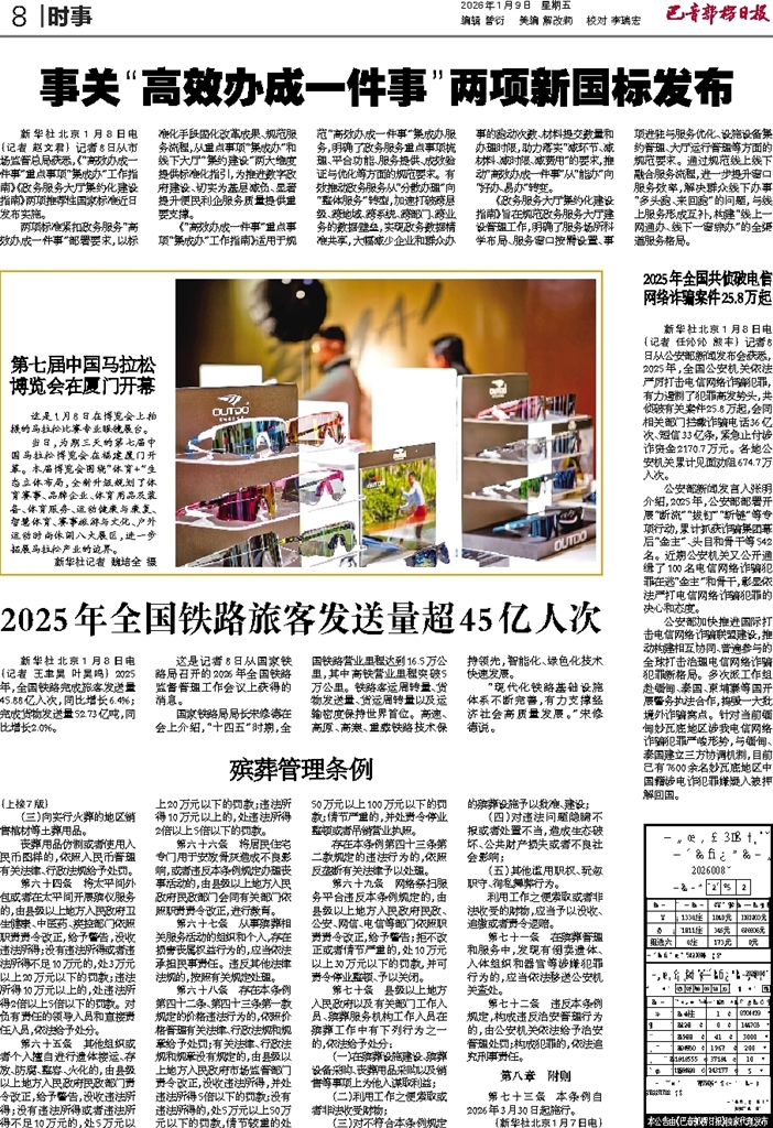 - 事关“高效办成一件事”两项新国标发布 新华社北京1月8日电 (记者 赵文君) 记者8日从市场监管总局获悉,《“高效办成一件事”重点事项“集成办”工作指南》《政务服务大厅集约化建设指南》两项推荐性国家标准近日发布实施。 两项标准紧扣