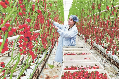 1月7日,乌鲁木齐高新技术产业开发区(新市区)北区工业园的高新植物工厂内,工作人员正在采摘成熟的普罗旺斯雪山果和玲珑雪山果番茄。入冬以来,该工厂生产的这两种果蔬线上线下持续旺销,已覆盖全国31个省区市。
