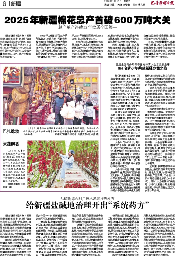 - 给新疆盐碱地治理开出“系统药方” 据《新疆日报》消息 (石榴云/新疆日报记者 刘毅) 记者从自治区农业科学院获悉:日前,由新疆盐碱地综合利用中心等4家单位共同编制的《新疆盐碱地综合利用技术发展报告》正式发布,为新疆盐碱地精准治理提