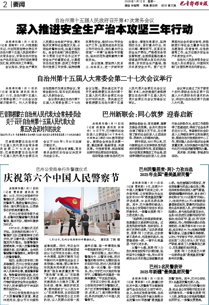 - 庆祝第六个中国人民警察节 本报库尔勒1月11日讯 (记者 景丽君 通讯员 安静) 10日,巴州公安局举行升警旗仪式,庆祝第六个中国人民警察节,激励全警牢记初心使命、强化责任担当,以昂扬姿态护航高质量发展。 巴州公安局领