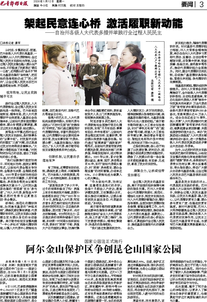 □本报记者 廖军 从村庄、乡镇到社区、街道,巴州各级人大代表扎根基层、一线履职,以人大代表联络站、全过程人民民主实践站为阵地,让全过程人民民主理念融入群众生产生活,不仅畅通了民意表达“