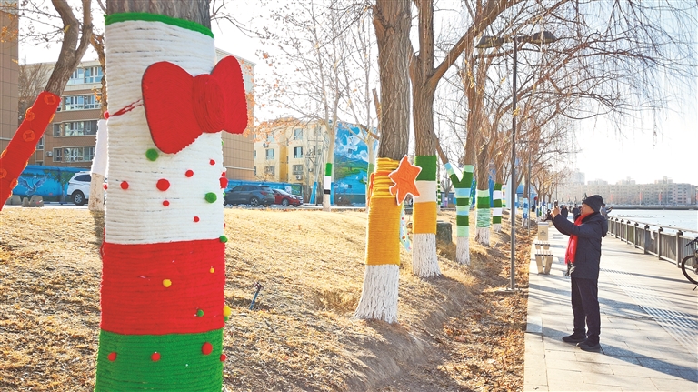 冬日,库尔勒市杜鹃河畔天鹅驿站周边的树木披上时尚“毛衣”。这些创意“冬装”不仅扮靓了梨城,也让这里成为市民游客争相前往的打卡新景点。图为游客在创意“冬装”前打卡留影(1月15日摄)。本报记者 薛兵 摄