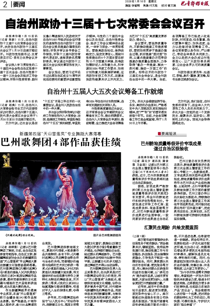 - 巴州歌舞团4部作品获佳绩 本报库尔勒1月15日讯 (记者 杨柳青) 记者从巴州歌舞团了解到,日前,由自治区党委宣传部指导,自治区文联、新疆舞蹈家协会主办的新疆第四届“天山雪莲奖”专业舞蹈大赛在新疆文化馆剧场圆满落幕。巴州歌