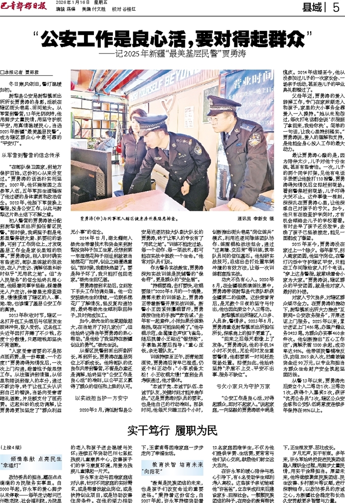 □本报记者 景丽君 冬日寒风依旧,警灯温暖如初。 尉犁县公安局尉犁镇派出所所长贾勇涛的身影,活跃在辖区街头巷尾、田间地头。从军营到警营,13年光阴流转,他用脚步丈量民情,用坚守护航