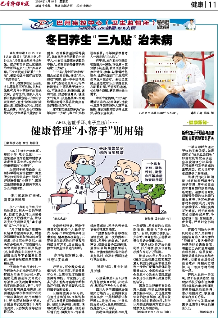 - 健康管理“小帮手”别用错 □新华社记者 李恒 彭韵佳 AED(自动体外除颤器)、智能手环、电子血压计……越来越多医疗器械和健康设备走进日常生活,成为公众健康管理的“小帮手”。 如何科学使用设备?如何科学看待监测数