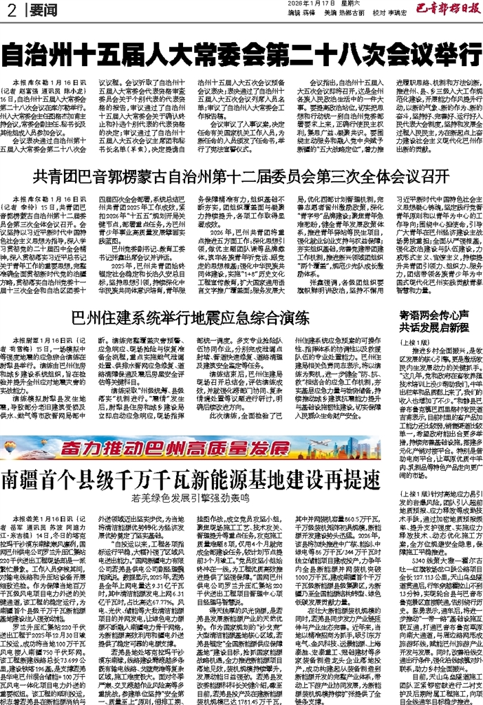 - 南疆首个县级千万千瓦新能源基地建设再提速 本报若羌1月16日讯 (记者 岳军 通讯员 苏波 阿迪力江·米吉提) 14日,冬日的塔克拉玛干沙漠东南缘寒风凛冽,国网巴州供电公司罗兰升压汇集站220千伏送出工程现场却是一派繁忙景象。工作人员穿梭