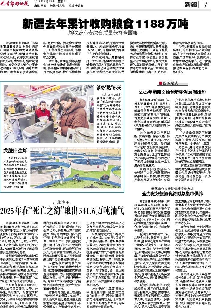 - 新疆去年累计收购粮食1188万吨 据《新疆日报》消息 (石榴云/新疆日报记者 刘毅) 记者从自治区粮食和物资储备局获悉:2025年,新疆坚持市场化收购为主,发挥政策性收储托底作用,精准抓好粮食收储调控。全区各类入统企业累计收购粮食