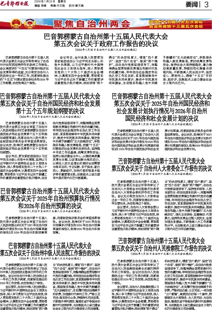 - 巴音郭楞蒙古自治州第十五届人民代表大会第五次会议关于2025年自治州预算执行情况和2026年自治州预算的决议 巴音郭楞蒙古自治州第十五届人民代表大会第五次会议审查了自治州人民政府提出的《关于2025年自治州预算执行情况和2026年自治州预算草案的报告》及2026年自治州本级预算草案,同意财政经济委员