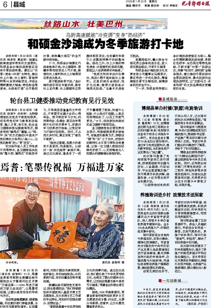 - 焉耆:笔墨传祝福 万福进万家 本报焉耆1月22日讯 (通讯员 姬智明) 21日,焉耆县委宣传部联合新疆丝路书画院在永宁镇南河社区开展“万福迎春——2026年送万福进万家公益活动”,以笔墨传祝福,让群众感受浓浓的年味与关怀。