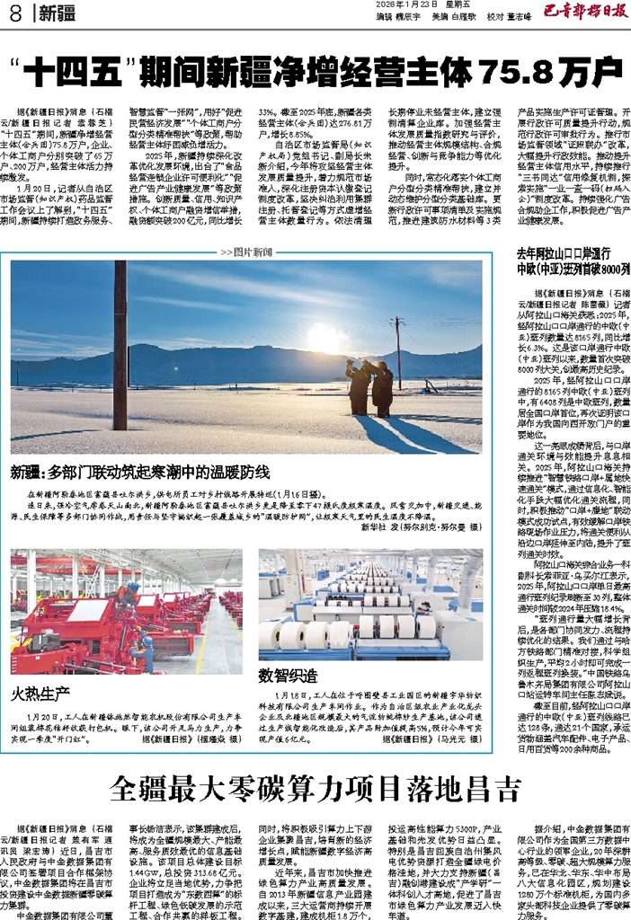- “十四五”期间新疆净增经营主体75.8万户 据《新疆日报》消息 (石榴云/新疆日报记者 索蓉芝) “十四五”期间,新疆净增经营主体(含兵团)75.8万户,企业、个体工商户分别突破了65万户、200万户,经营主体活力持续激发。 1月20日