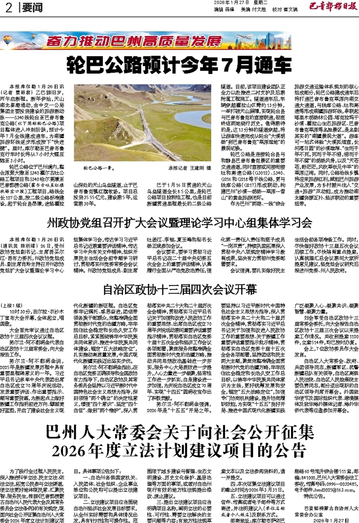 - 轮巴公路预计今年7月通车 本报库尔勒1月26日讯 (记者 景丽君) 乙巳辞旧岁,丙午启新程。新年伊始,天山南北春潮涌动,由中交一公局集团主要投资建设的旅游新动脉——S340线轮台至巴音布鲁克公路(以下简称轮巴公路)项目整体
